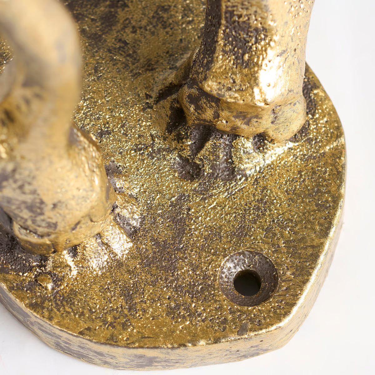 A decorative hook board from our featuring a vintage metal plate attached to sculpted antlers hanging accessories on a wall that coordinates well with cabin decor. Antlers design features metallic gold finish with antique detailing. Our Antlers hook board is easy to hang against wall via predrilled holes. A vintage cabin-themed home accent perfect for seasonal display.