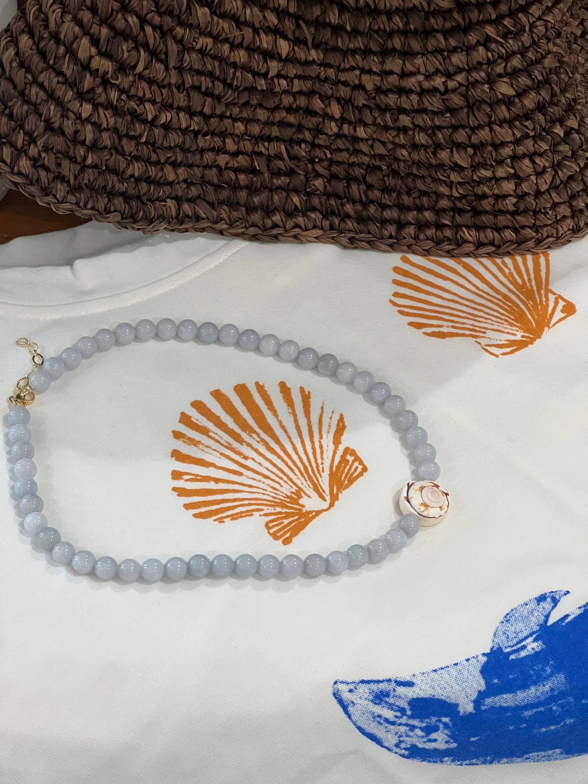 blue stone beading with a cat eye shell centerpiece, just so everyone knows your're a mermiad!
