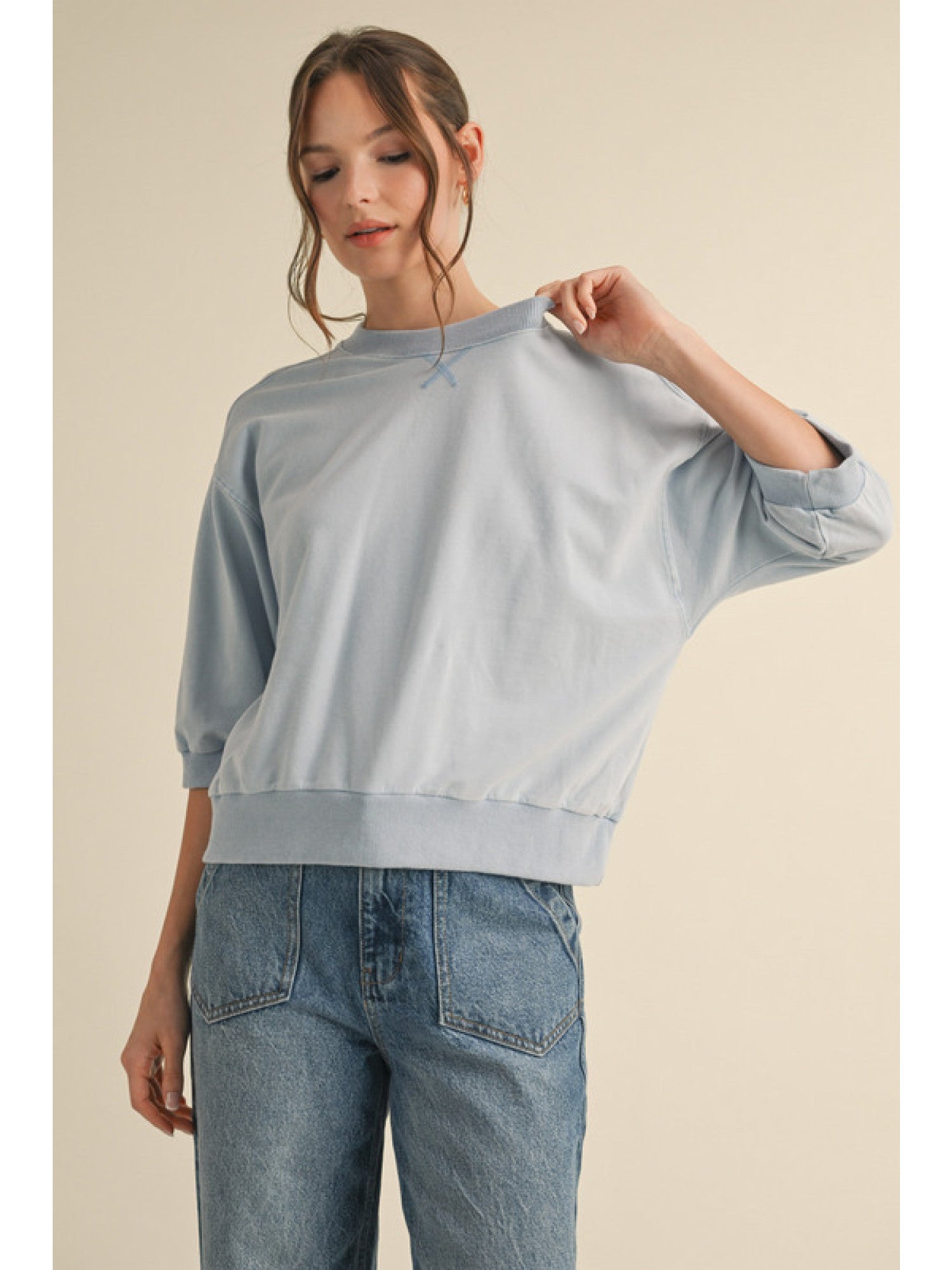 Solid sweatshirts top with crew neck, drop shoulder, three quarter dolman sleeves, ribbing at the sleeve ends and hemline.
