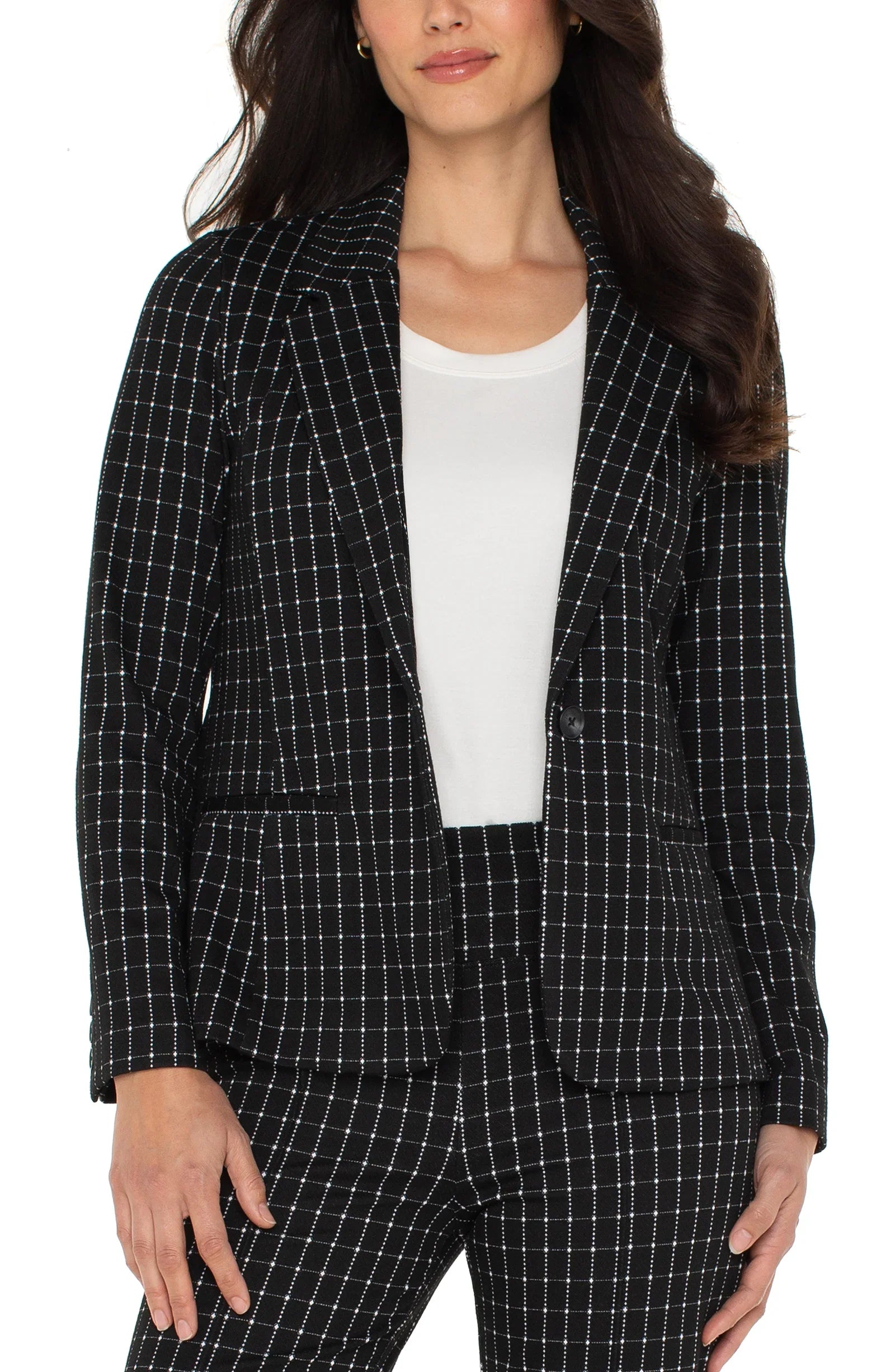 A sleek, modern blazer in a classic black and white windowpane check. The fitted silhouette and single button closure create a clean, streamlined shape, while front pockets add functional polish. A timeless piece that elevates any look from day to night.