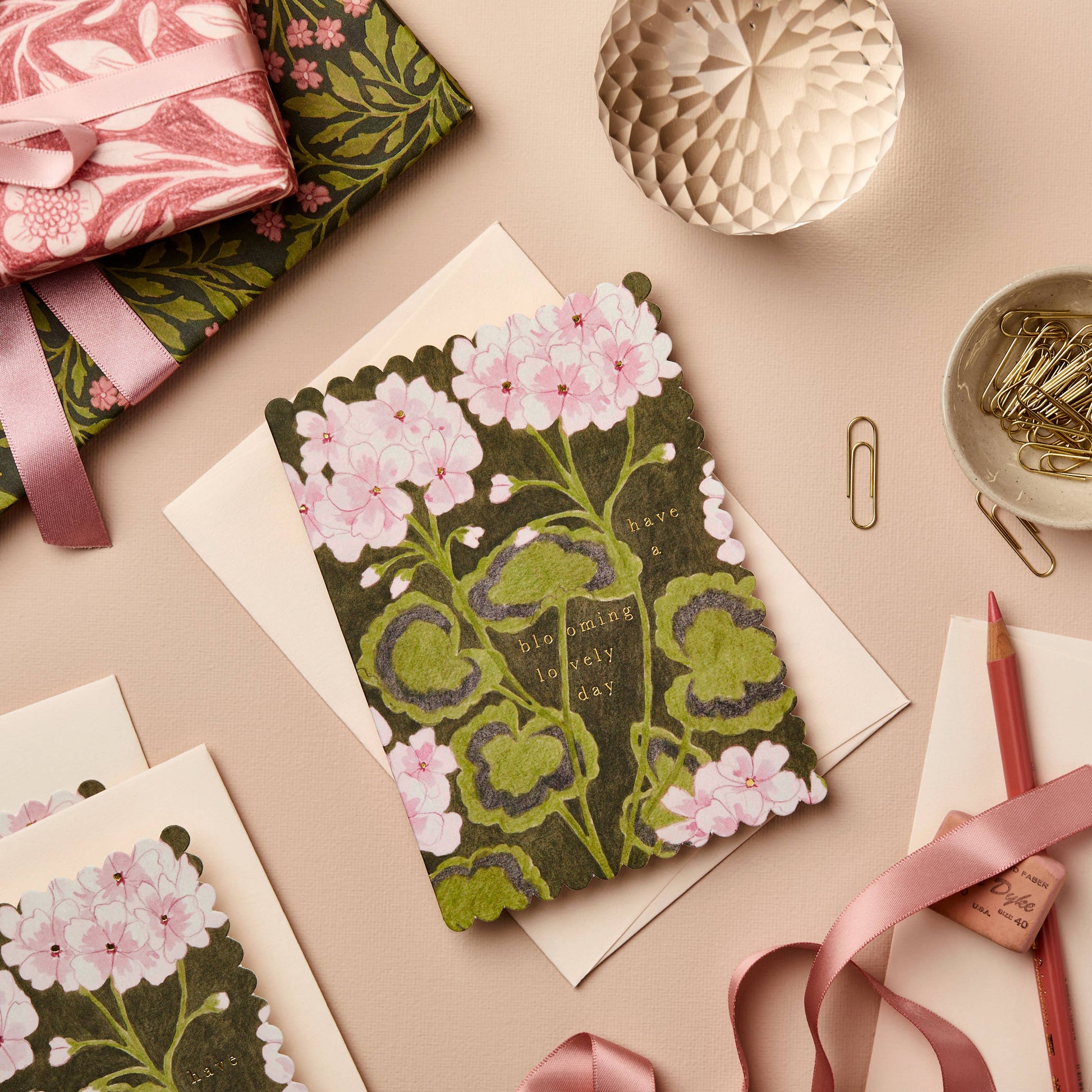 A new addition to our Flora collection, this little card has been created from an original gouache painting of a zonal geranium, and features a die cut scalloped edge. A delicate golden foil greeting reads 'have a blooming lovely day'. This card is paired with a luxury blush pink envelope. Designed and packed with care from our studio in Hove, England. Printed in the UK on FSC certified papers