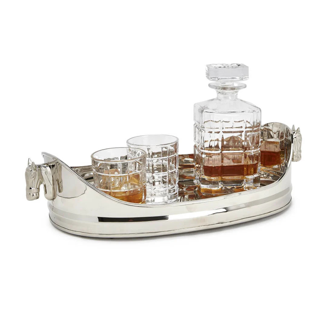 14/4 Stainless Steel with Nickel Plating. India. 18 1/2" W x 10 3/4" D x 4 1/4" H. Features horse handle details . Crafted from stainless steel . Nickel plated finish. Wipe clean with damp soft cloth.