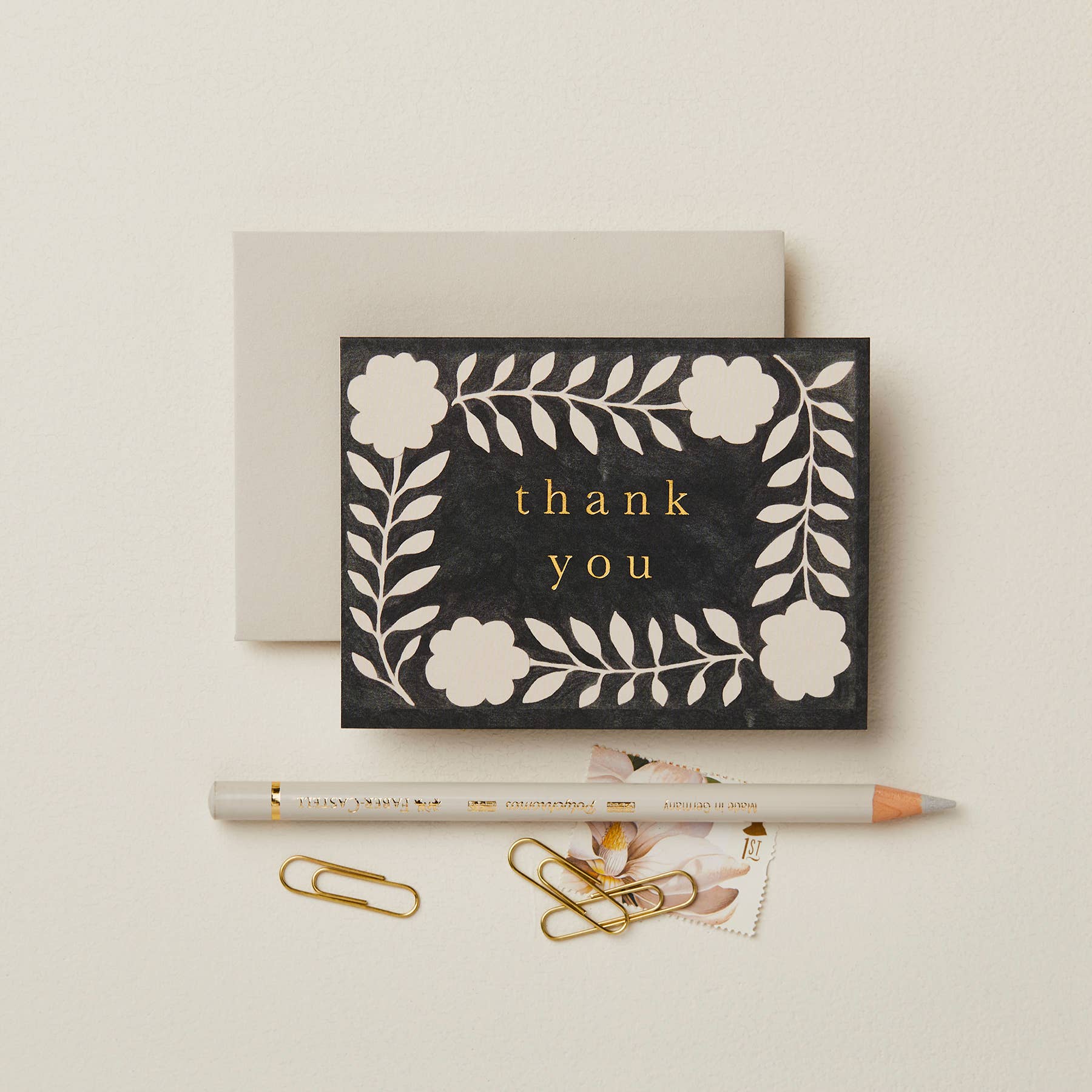 No. 21 Ink Flora A deep black floral motif and gold foil 'thank you' adorn this mini card. Each one is paired with a pale grey C7 envelope. Designed and printed in the UK on FSC certified papers