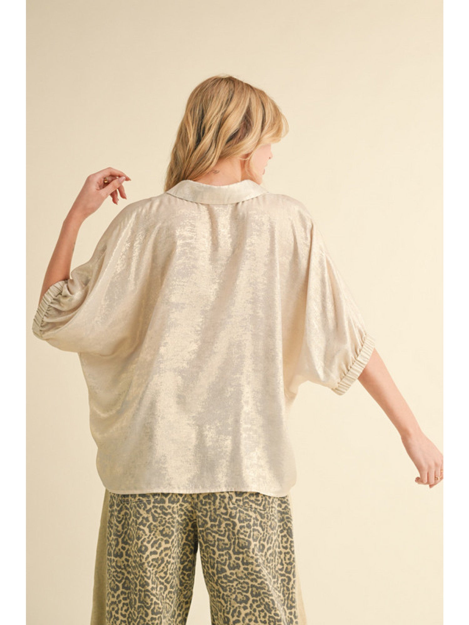 Metallic top with open collared neck, Half dolman sleeves, and stretch-band cuffs.