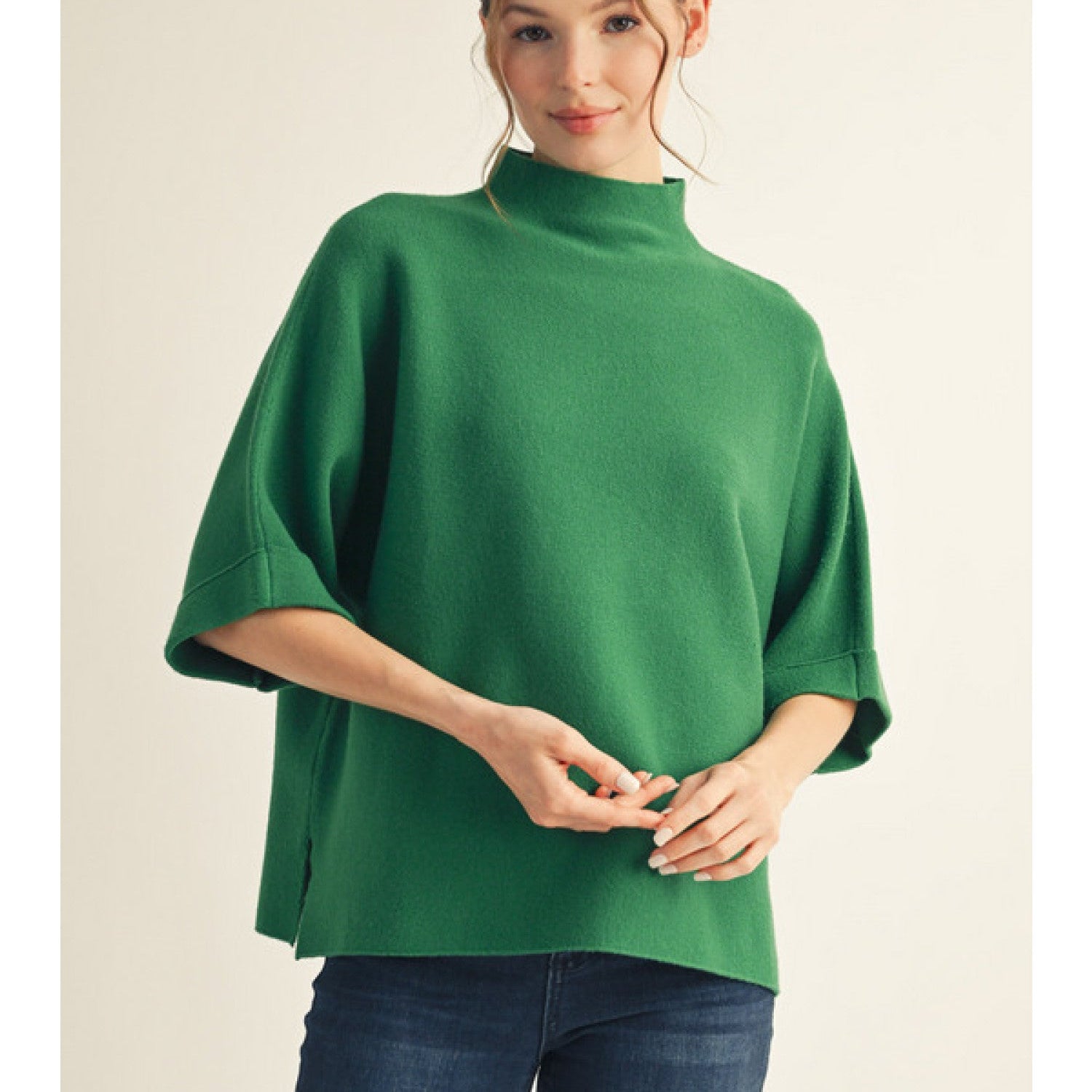 Drop shoulder mock neck soft sweater top with side slit detail.