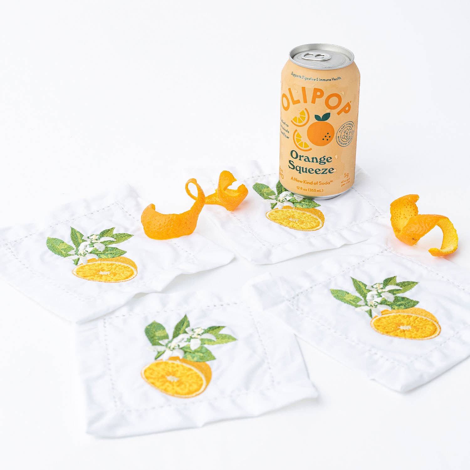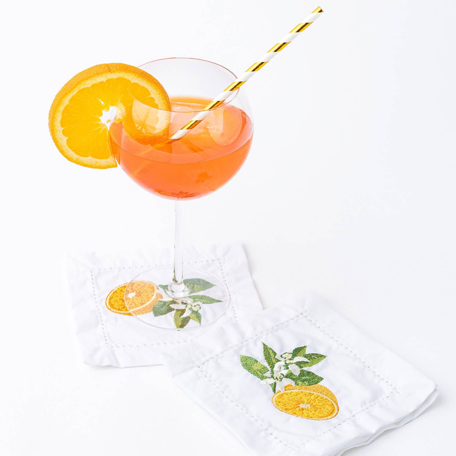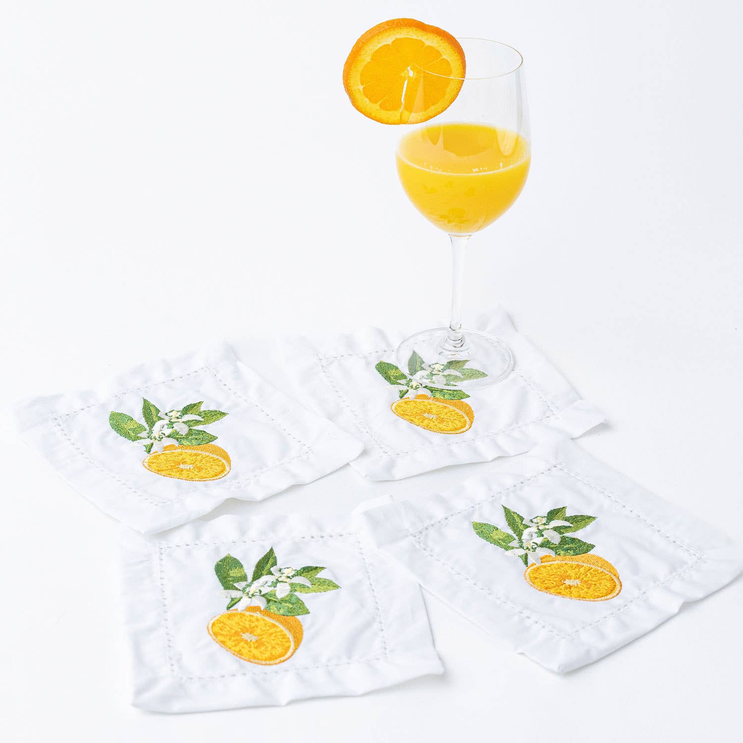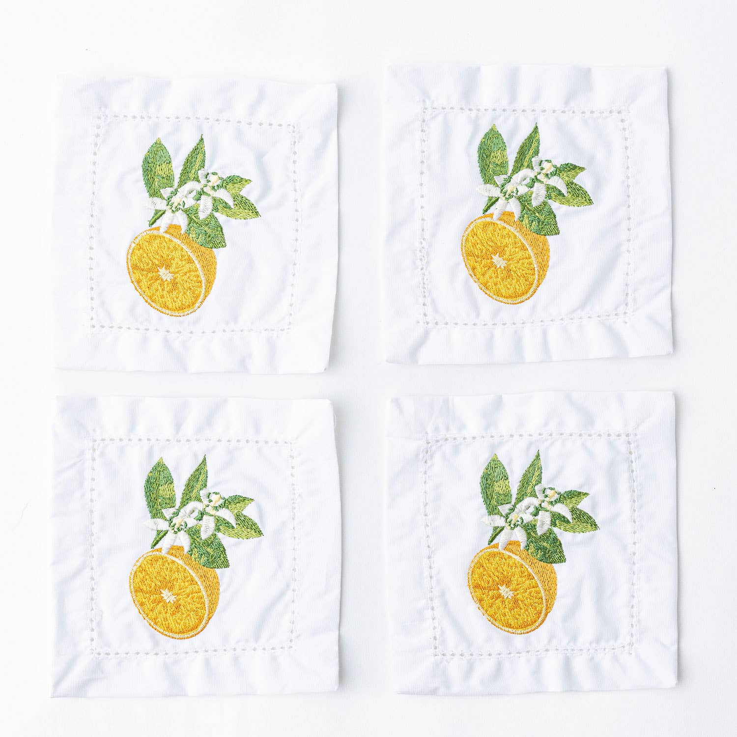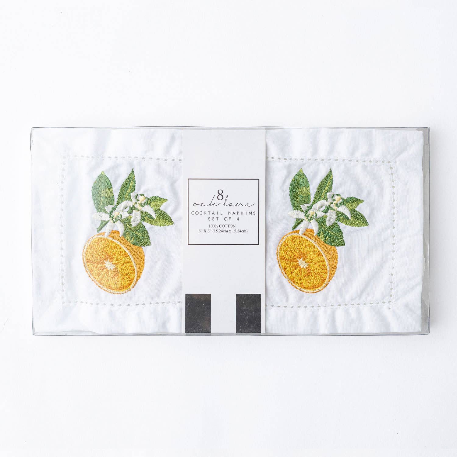 Enhance any gathering with the Orange Blossom Embroidered Cocktail Napkin Set. These chic napkins infuse fun into ordinary dinner parties in a stylish & fashionable way. The crisp white 100% cotton material creates the perfect backdrop for the bold embroidery on each one. With orange blossoms stitched on each one, these napkins are sure to start a conversation at every event. They're extra convenient since they are boxed & ready for easy gifting. Feel like a true hostess with this unique set of four charismatic cocktail napkins designed in the USA & imported for your special nights!