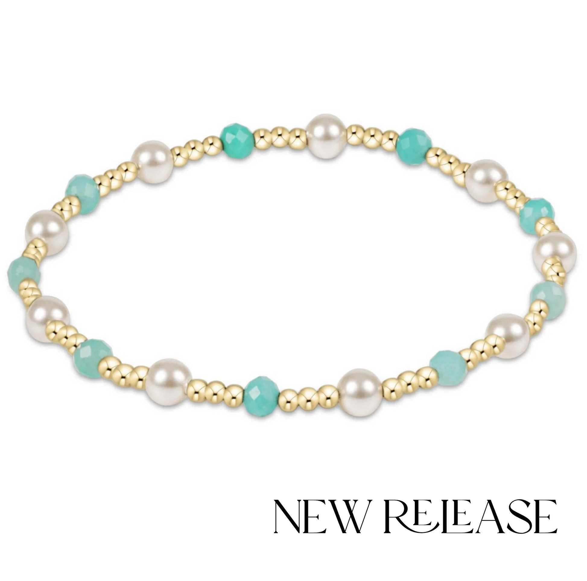 You will fall in love with this classic gold sincerity pattern 4mm bead bracelet with pearl and gemstone.