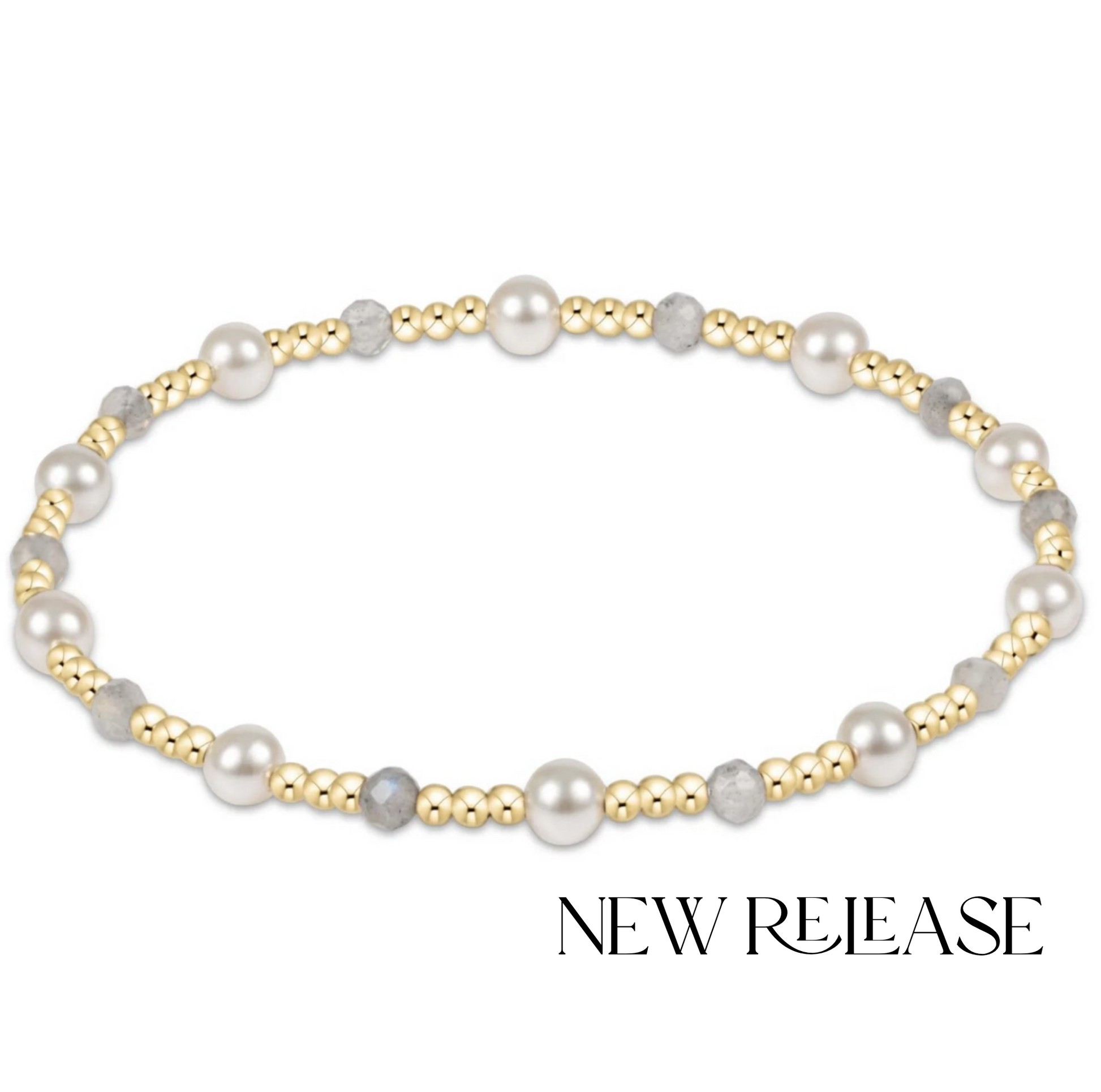 You will fall in love with this classic gold sincerity pattern 4mm bead bracelet with pearl and gemstone.