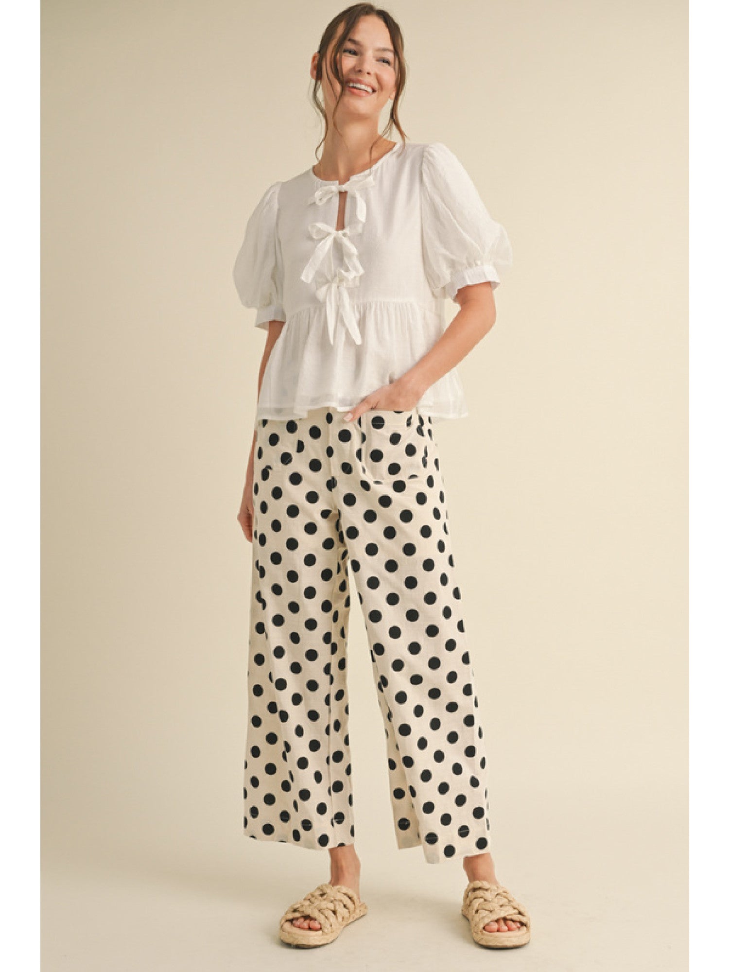 Polka dot print wide leg pants with hidden and zipper closure, back stretch band, side/back pockets.