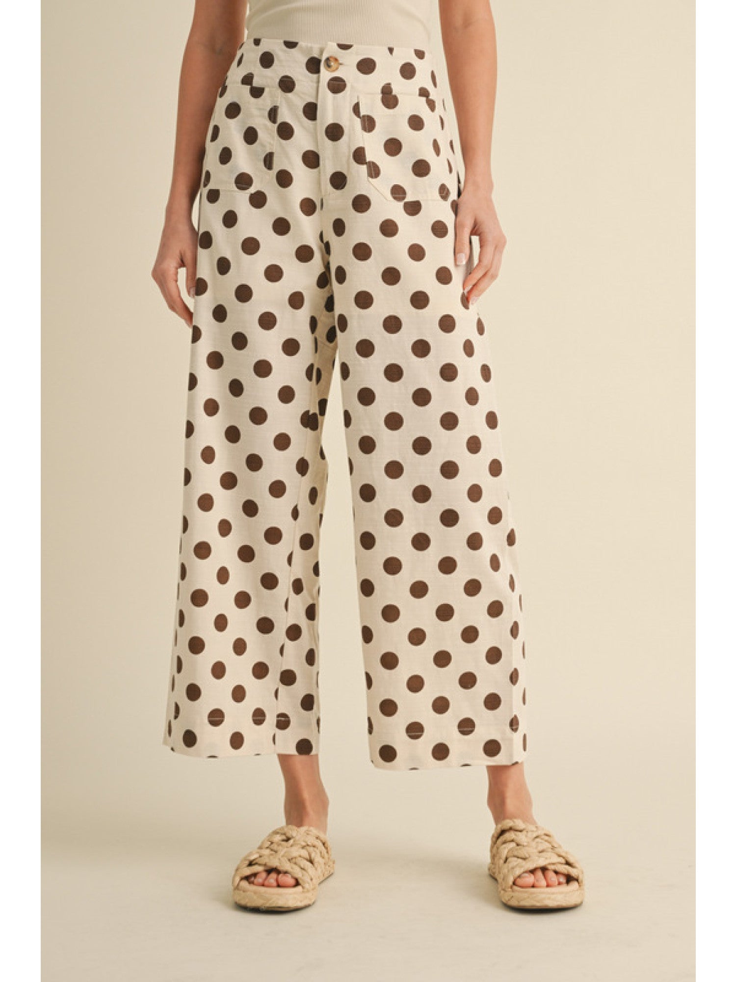Polka dot print wide leg pants with hidden and zipper closure, back stretch band, side/back pockets.