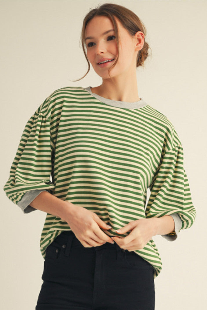 3/4 puff sleeves stripe top with solid contrast binding detail.