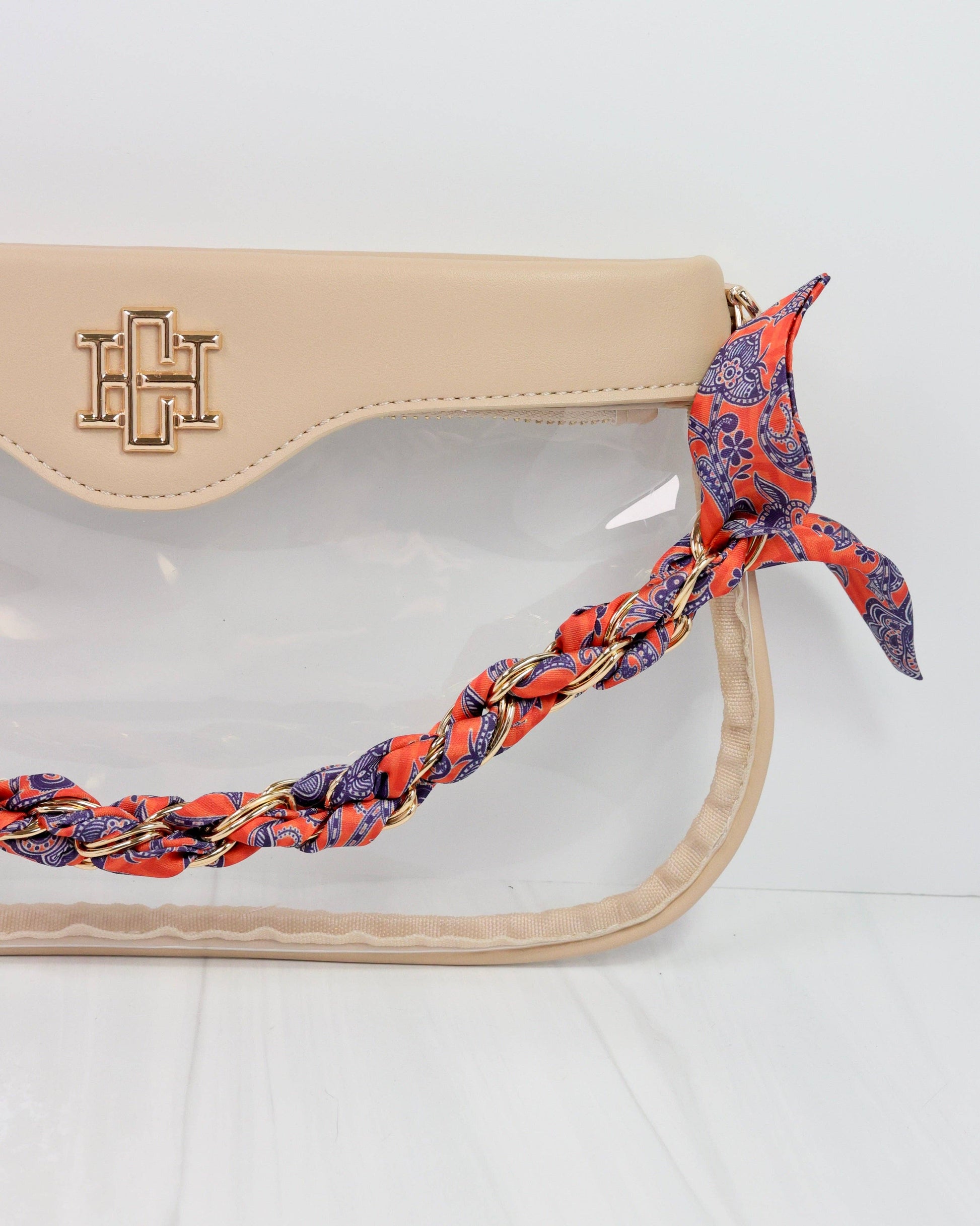 Elevate your accessory game with the Serafina Scarf Purse Chain in a playful Blue and Orange print. Featuring a chic gold link chain intertwined with a stylish printed scarf, this piece effortlessly combines school spirit with sophisticated fashion. Perfect for adding a refined yet spirited touch to your favorite handbag.