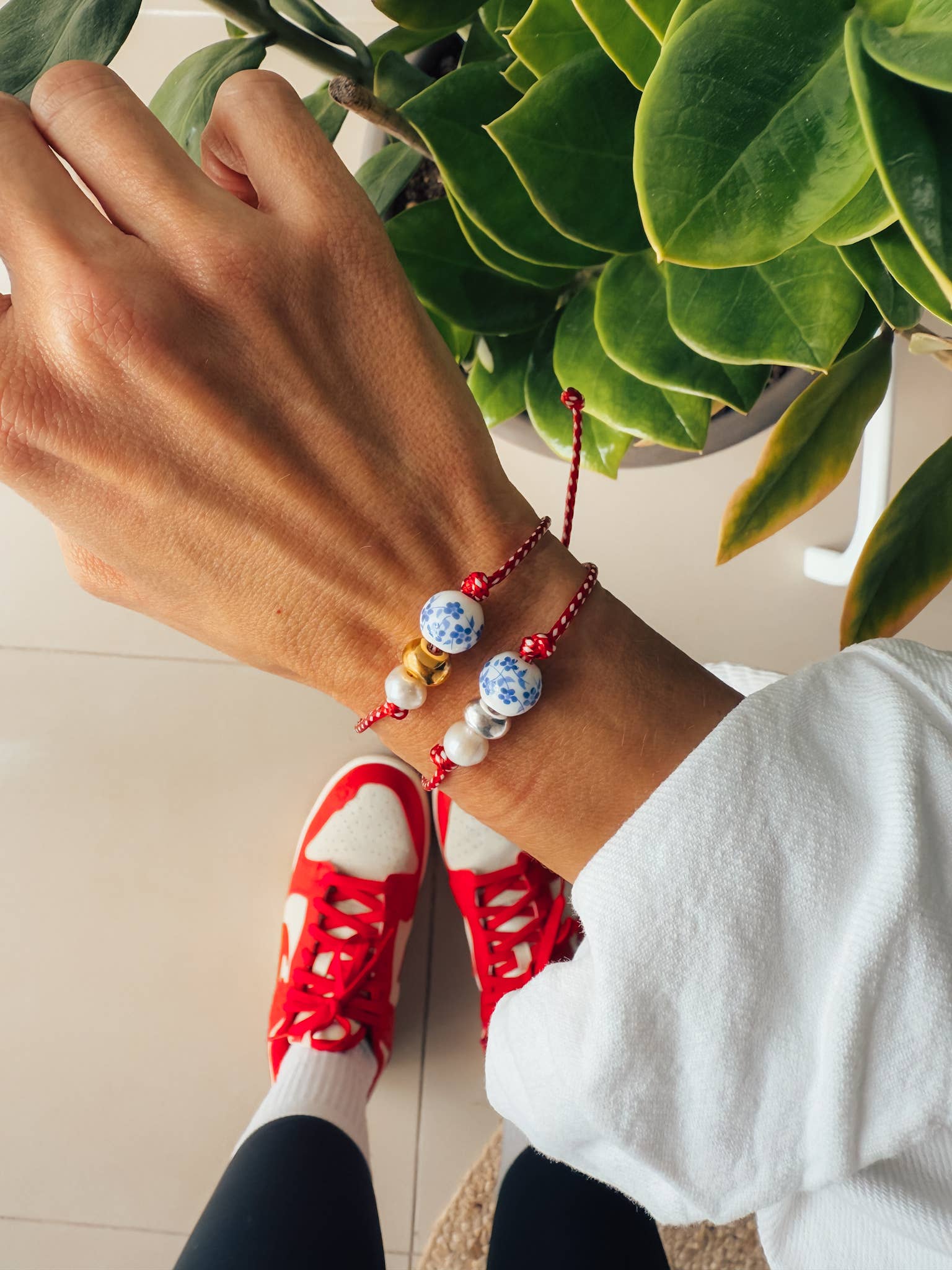 Red Cord Porcelain Bead and Pearl Bracelet